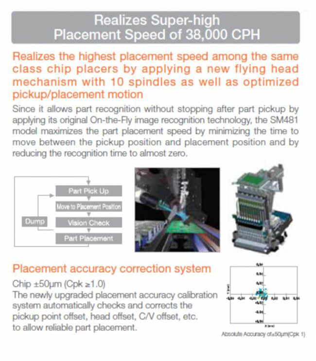 Samsung SM481 Advanced High-Speed Flexible Mounter is a general component placer whose vision system is reinforced based on the platform of the SM471 high-speed chip shooter and whose chip placement speed is the highest among the same class component placers, the SM481 realized a chip placement speed of 39,000 CPH, the highest among the same class component placers, by applying a head with one gantry and ten spindles as well as new flying vision and by maximizing the pickup and placement motion.