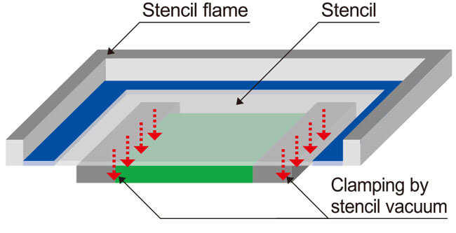 A stencil vacuum mechanism delivers consistent high accuracy printing with no effects from stencil droop. Also drastically cuts the setup time since no offset entry is needed during back and forth printing movement.