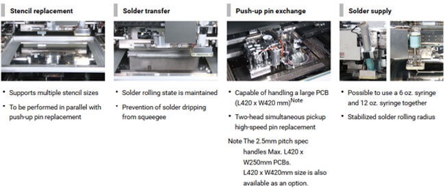 Automatic replacement of the stencil and push-up pins. Through a combination with automatic changeovers in the entire line, man-hours and the number of human errors in model changeover have been drastically reduced. Nonstop solder supply with a 12 oz. syringe achieves prolonged, unmanned, nonstop solder printing.