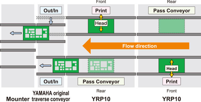 Connecting two YRP10s in series enables a fully independent dual-lane operation. A dual-lane operation and an automatic changeover feature are supported at the same time. Addition of a traverse conveyor flexibly connects the YRP10s to the downstream equipment.
