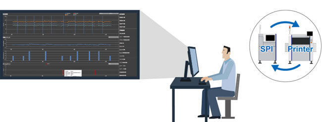 Displays link between fluctuations in solder size and solder paste printing status and allows checking the solder paste printer status when defects or problems occur. Streamline quality improvements and line operating rate.