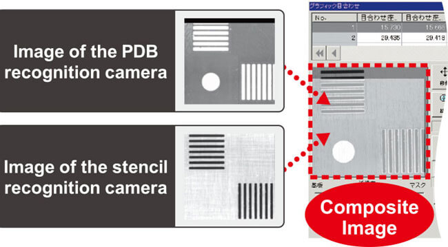 By images from two cameras are combined in layer, thereby operation of the PCB to printing stencil relative positioning can be performed simply and accurately.