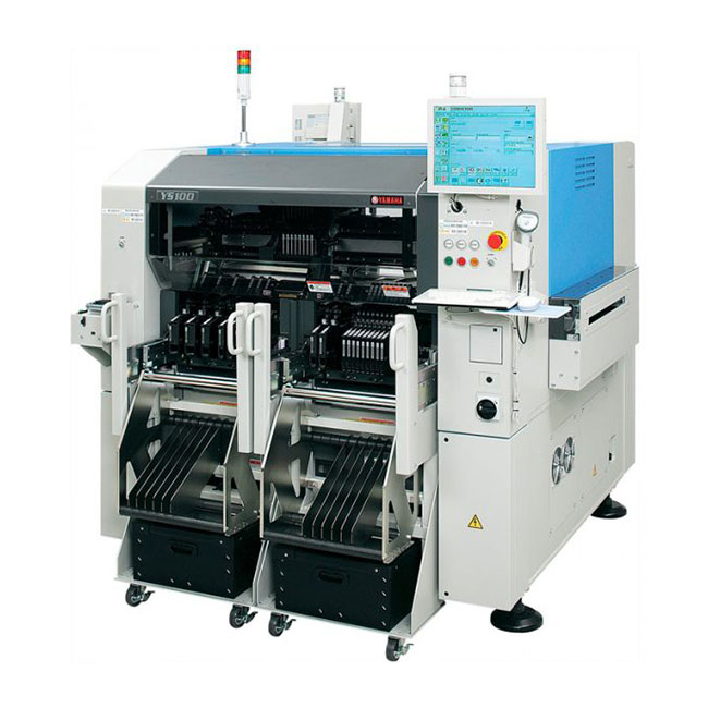 Yamaha YS100 Pick and Place machine is designed with a high precision single placement beam that carries eight independent Z-servo controlled heads. The YS100 SMT Mounter provides a perfect balance between the chip and IC shooting. Yamaha YS100 is available in two (2) versions, one with a Flying Nozzle Change (FNC) head for when many nozzle changes are needed and high output is important, and the other with a Super Fine (SF) head for use with a wider component range including QFPs, connectors and tall components.