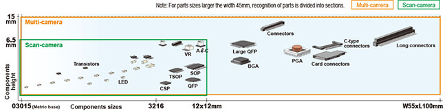 High-speed and high-accuracy parts recognition to sizes exceeding 12mm or heights exceeding 6.5mm.