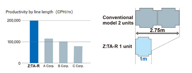 Even though a 4-beam unit, its small footprint and its design feature a width of only 1 meter and depth of 2.1 meters. The Z:TA-R delivers superb productivity per line length and productivity per surface area. It is a powerful tool for making maximum use of limited factory space!Productivity by line length(CPH/m)