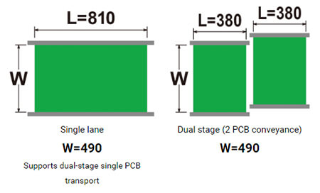 Conveyor system is selectable from dual stage, single lane. Supports PCB sizes to a max.L810 x W490 mm (Dual stage, single lane for conveying single PCB). Single lane also available in M size specifications (max. PCB size L360 x W490 mm) having superior cost performance.