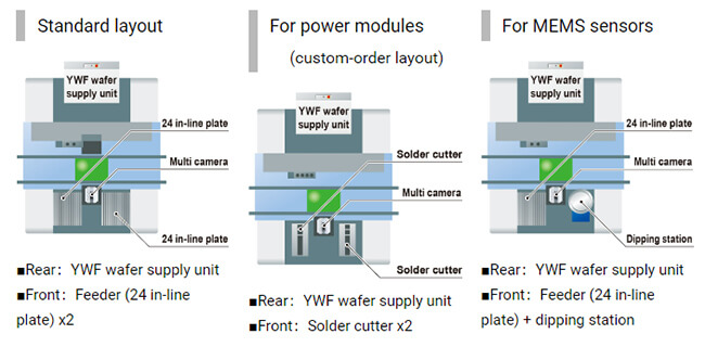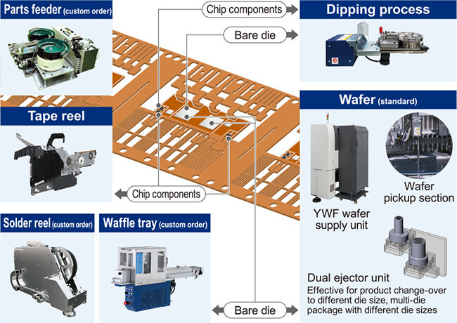 It is capable of various types of the production process, and YRH10 realizes SMT for semiconductor, SMD in one unit. Post-mounting inspection is provided as a standard feature.